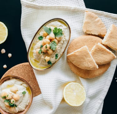 Traditional Arabic mezze - hummus, moutabal, fattoush, and fresh bread