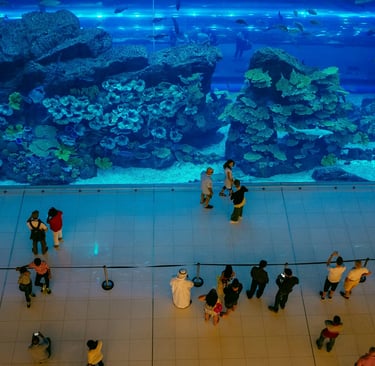 More than shopping, Dubai Mall functions as entertainment destination housing 1,200+ stores, the Olympic-sized Dubai Ice Rink, KidZania children's edutainment center, VR Park gaming experiences, and countless dining options. The Dubai Aquarium's 10-million-liter tank houses 33,000 aquatic animals visible through a massive acrylic panel in the mall's atrium—free to view from outside, with paid experiences including tunnel walks, cage diving with sharks, and behind-the-scenes tours. The adjacent Underwater Zoo showcases penguins, otters, and diverse marine life. The mall connects directly to Burj Khalifa and the Dubai Fountain's outdoor promenade, creating full-day experience combining shopping, entertainment, and iconic landmarks.